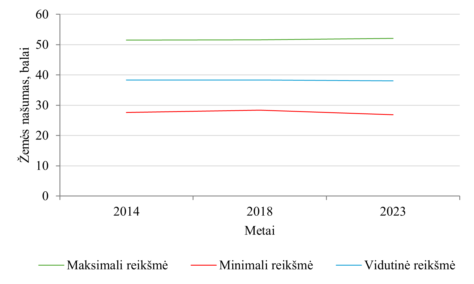 1 pav. Lietuvos Respublikos žemės našumo maksimalios, minimalios ir vidutinės reikšmės (balais) 2014, 2018 ir 2023 m.