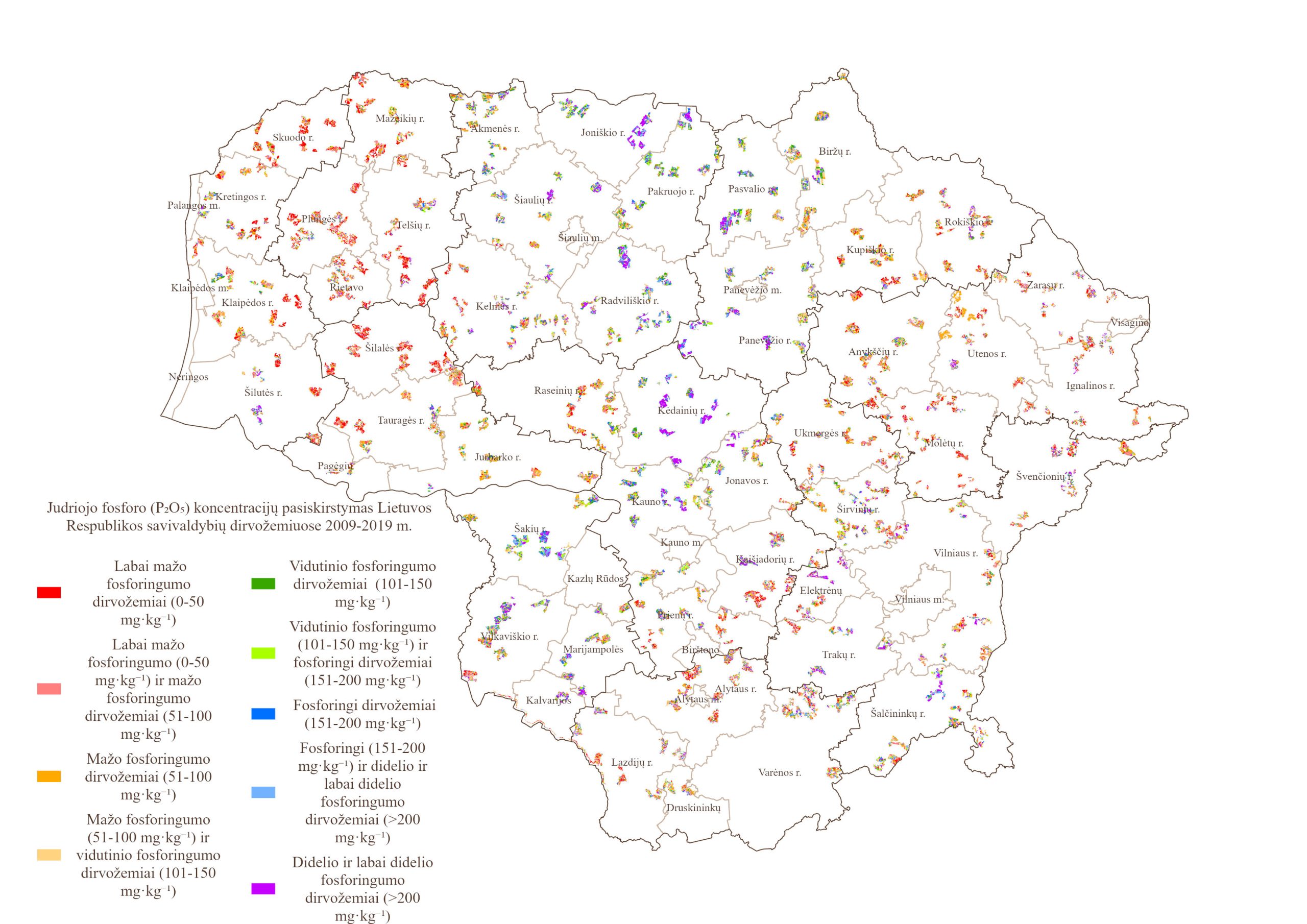 3 pav. Judriojo fosforo (P2O5) koncentracijų (mg∙ kg-1) pasiskirstymas Lietuvos Respublikos savivaldybių dirvožemiuose 2009-2019 m.