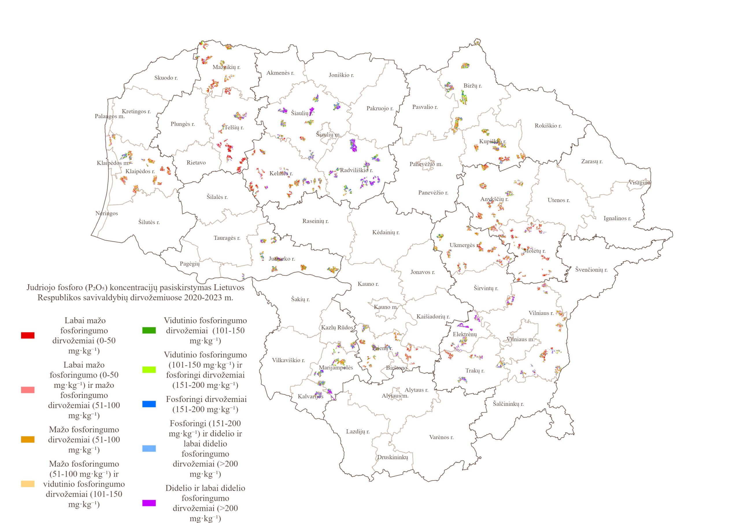 4 pav. Judriojo fosforo (P2O5) koncentracijų (mg∙kg-1) pasiskirstymas Lietuvos Respublikos savivaldybių dirvožemiuose 2020-2023 m.