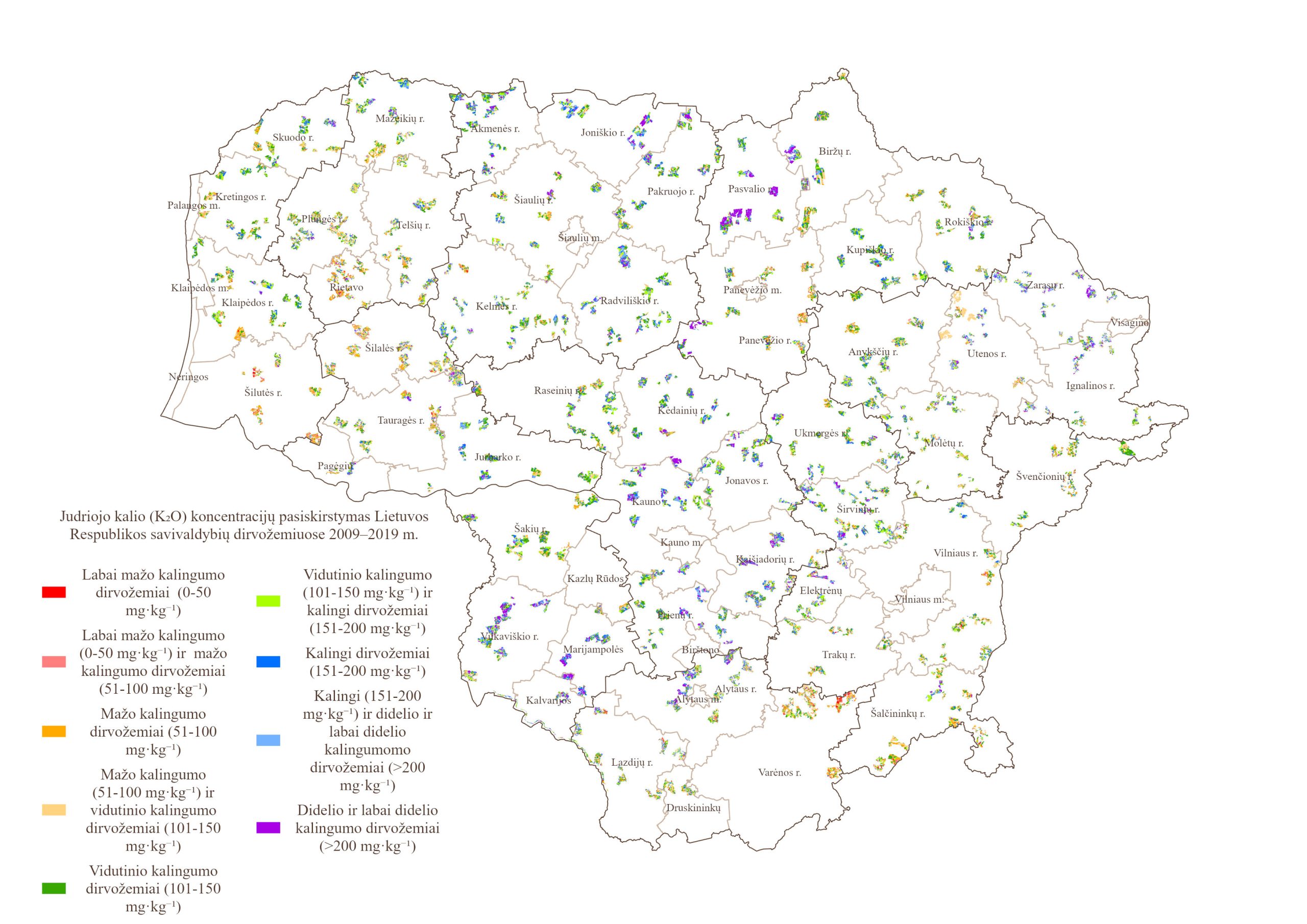 5 pav. Judriojo kalio (K₂O) koncentracijų (mg∙kg-1) pasiskirstymas Lietuvos Respublikos savivaldybių dirvožemiuose 2009–2019 m.