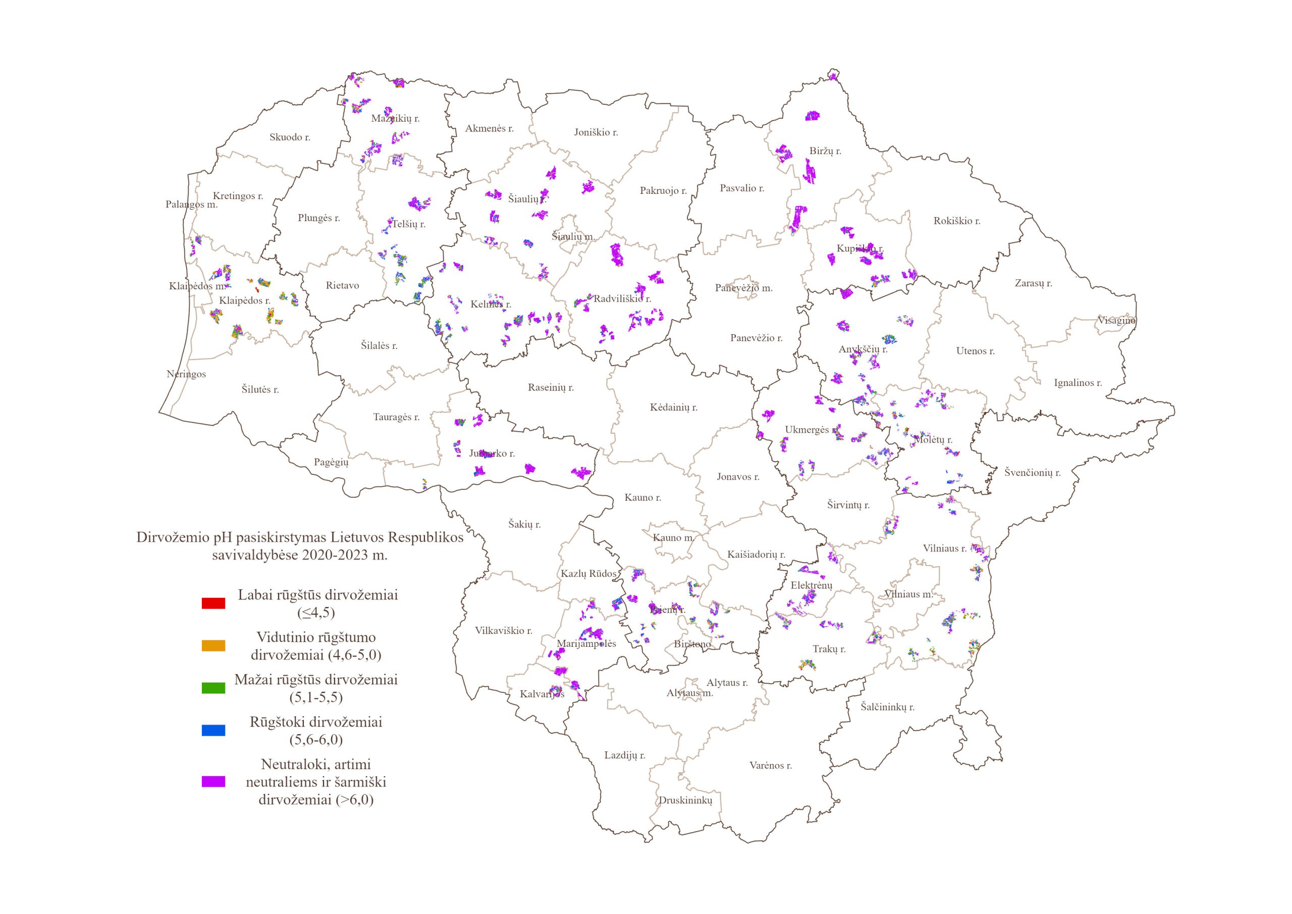 2 pav. Dirvožemio pH reikšmių pasiskirstymas Lietuvos Respublikos savivaldybių teritorijose 2020-2023 m.