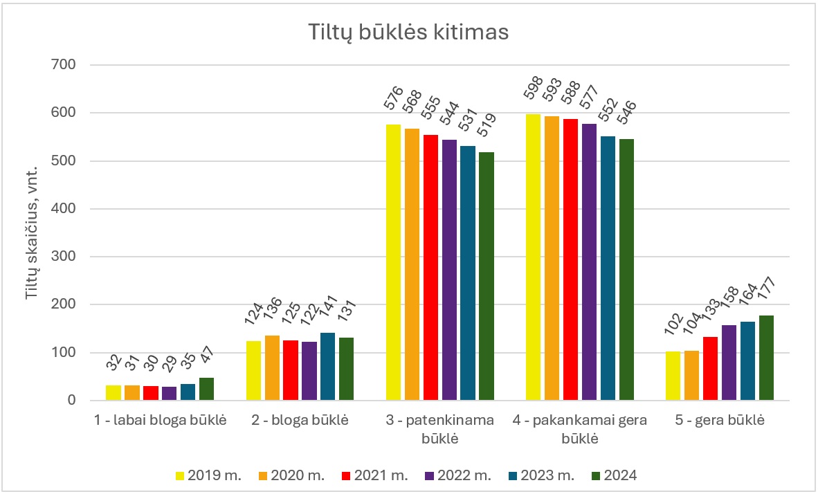 1 pav. Valstybinėje melioruotos žemės ir melioracinių statinių apskaitoje esantys tiltai ir jų būklė 2019–2024 m.
